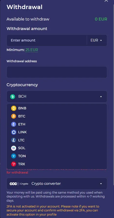 Om te storten, open je de cashier, kies je een methode, stel je het bedrag in (minimum €20) en bevestig je. In Nederland zijn stortingen direct voor Visa, Mastercard, Maestro, PayID, Apple Pay, Google Pay, Revolut, crypto (zoals USDT of BTC), bankoverschrijving en e-wallets. Uitbetalingen volgen de tijdlijnen per methode, en standaardlimieten zijn van toepassing per periode.